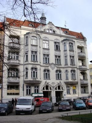 La Kamienica est un immeuble locatif en brique avec trois structures arrière situé à Szczecin, présentant des corniches décoratives et des designs de fenêtres variés sur sa facade symétrique. Les appartements sont distribués dans le bâtiment principal et dans trois structures arrière autour d'une cour centrale avec une fontaine en pierre, avec des éléments Art Nouveau visibles partout.