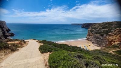 Praia de Beliche est une plage entre Lagos et Sagres sur la côte atlantique occidentale dans le parc naturel de la Côte Vicentine, entourée de falaises calcaires escarpées. La zone de sable se divise en deux sections qui exposent ou recouvrent des formations rocheuses selon le niveau des marées.