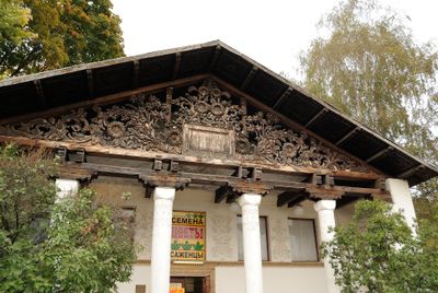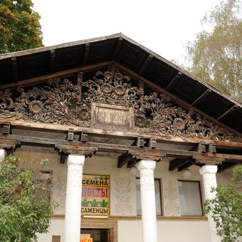 Le bâtiment symétrique présente six colonnes fines soutenant un fronton en bois orné de sculptures florales et de motifs agricoles.