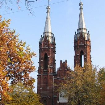 Cette église de Rybinsk est un bâtiment en brique conçu dans le style Néogothique, s'élevant sur trois étages avec des détails architecturaux distinctifs. La rosace au-dessus de l'entrée et la façade soigneusement travaillée témoignent du savoir-faire de ce bâtiment religieux.