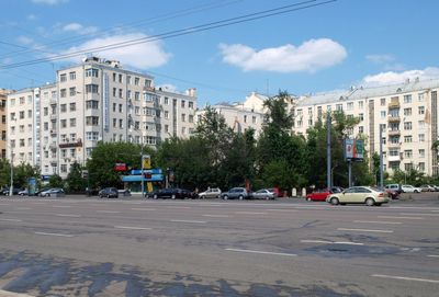 Le bâtiment de huit étages présente des lignes droites et des formes géométriques caractéristiques des principes architecturaux soviétiques.