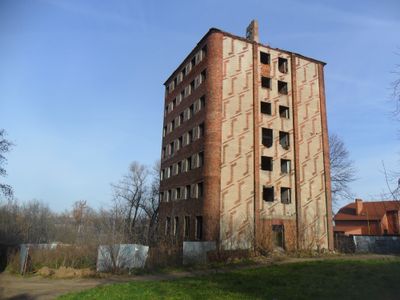 La Maison Commune de Smolensk est un immeuble résidentiel de sept étages aux coins arrondis et aux motifs décoratifs en brique, avec un design en zigzag distinctif sur sa façade sud. La structure se dresse sur la Colline de la Résurrection, offrant des vues sur le fleuve Dniepr.