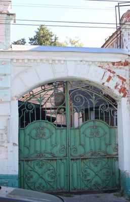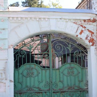 Кирпичные ворота с коваными решетками, architectural landmark in Gorodets, Russia