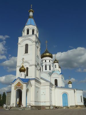 La Cathédrale de l'Intercession se dresse avec son clocher reconstruit de 33 mètres et ses deux nefs au centre de Shakhty.