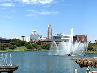 Le parc Heartland of America s'étend le long du fleuve Missouri avec un lac central, une fontaine et des sentiers pédestres à travers des espaces verts.