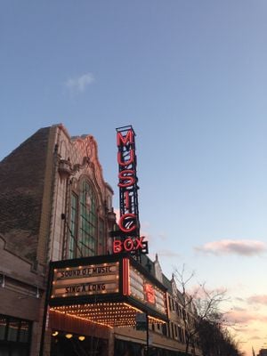 Le Music Box Theatre est un cinéma à Chicago avec environ 750 places dans la salle principale et une salle de projection plus petite pouvant accueillir environ 100 personnes. Le plafond de l'auditorium principal est peint en bleu foncé avec des lumières qui créent un effet de ciel nocturne.