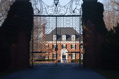 Située au 150 Finders Way à Charlottesville, Virginie, la propriété comprend deux garages reliés par des arcades en briques et un gazebo octogonal.