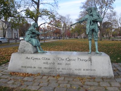 Le Irish Famine Memorial est un monument au centre-ville de Boston présentant des sculptures en bronze qui montrent la souffrance pendant la famine et les aspirations des Irlandais qui ont cherché refuge en Amérique. Des panneaux informatifs en plusieurs langues expliquent l'impact de la famine et les récits de ceux qui ont émigré.