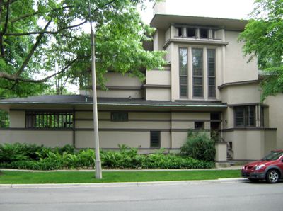 La maison s'écarte de l'accent horizontal typique de Wright avec sa tour centrale de trois étages et sa projection angulaire près de l'entrée.