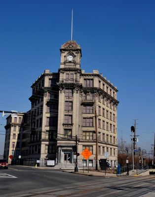 Le bâtiment de la Philadelphia Watch Case Company présente une structure de bureaux de sept étages avec une tour horloge de huit étages à l'angle.