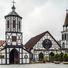 Le bâtiment religieux présente des éléments architecturaux allemands avec une structure en bois, des murs extérieurs noirs et blancs et des tuiles rouges.