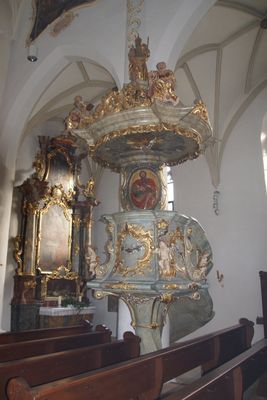 Pulpit of St. Jakob, Kanzel in der katholischen Pfarrkirche St. Jakob in Hahnbach, einer Marktgemeinde im oberpfälzer Landkreis Amberg-Sulzbach in Bayern