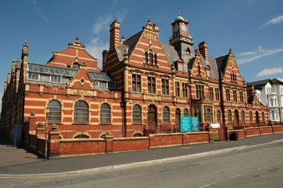 Le bâtiment Victoria Baths présente des briques multicolores, des décorations en terre cuite, des carreaux émaillés à l'intérieur et de nombreuses fenêtres en vitraux.