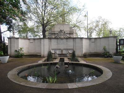Le mémorial en calcaire de Portland comprend un écran décoratif avec des sièges et un petit bassin dans la partie avant de la structure.