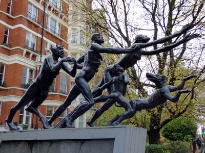 Rush of Green est une sculpture en bronze dans la City of Westminster qui represente une famille avec père, mère, fils et chien se déplacant dynamiquement vers un parc vert. Les figures sont accompagnées d'une figure qui joue de la flûte, ajoutant une dimension mythologique à la composition.