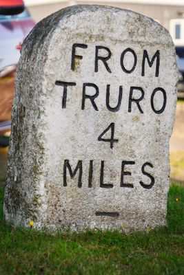 Milestone In Front Of Rowe's Garage, Trispen, milestone in St. Erme, Cornwall, UK