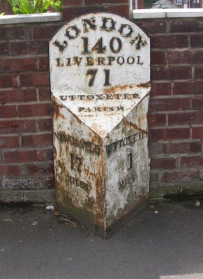 Milepost, milestone in Uttoxeter, East Staffordshire, Staffordshire, UK