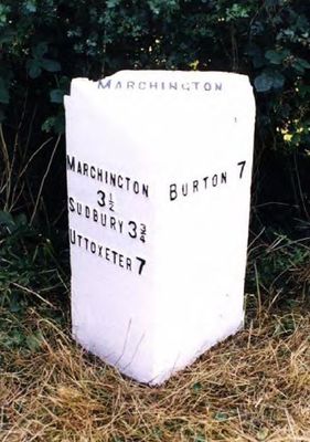 Milepost, south of Six Lane Ends, milepost in Hanbury, Staffordshire, England, UK