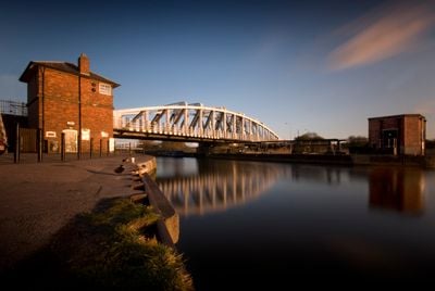 Le pont tournant Acton s'étend sur 83.5 mètres au-dessus de la rivière Weaver, avec deux fermes en acier rivetées et un mécanisme de rotation équilibré.