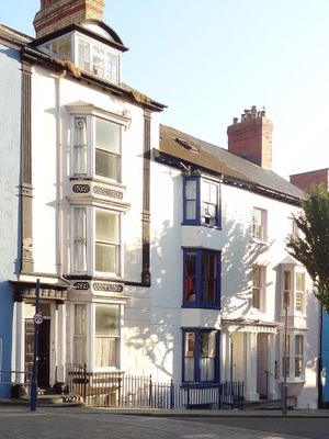 No.6 Portland Street, Grade II listed building in Ceredigion. Terraced near the top of the street, stepped in the slope with iron railings to the front of No 4