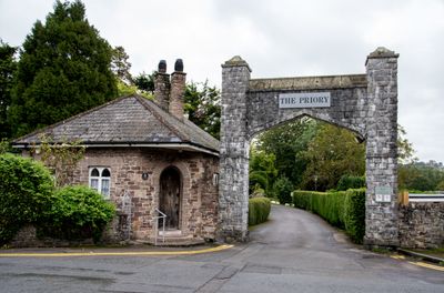 Entrance gates and railings of Priory House, Grade II listed building in Newport City. Along the street frontage of Priory House