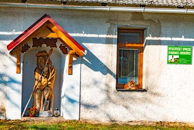 Socha, dřevěná socha svatého Huberta u myslivecké klubovny v Chudeřicích