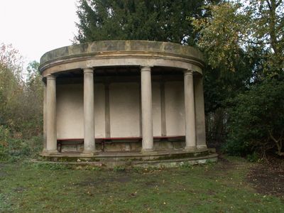 Summer house in Bridge Royd Wood approximately 200 metres west of Cascade Bridge in Breton Park, Grade II listed summer house in the grounds of Bretton Hall, West Bretton, Wakefield, West Yorkshire, UK
