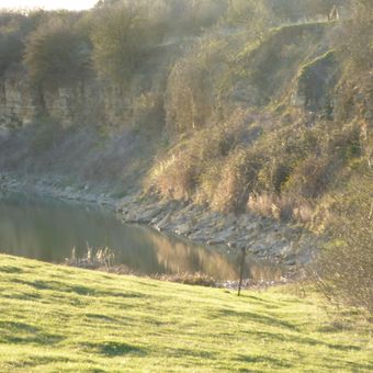 Un étang linéaire à la base de la falaise témoigne de l'histoire des excavations tout en dissimulant partiellement les strates géologiques inférieures.