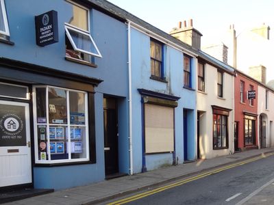 No.12 Eastgate, Grade II listed building in Ceredigion. Continuos row of frontages stepped in the slope; No 8 near the junction with Baker Street and No 18 offset to right of segmental arch leading to Gateway Buildings