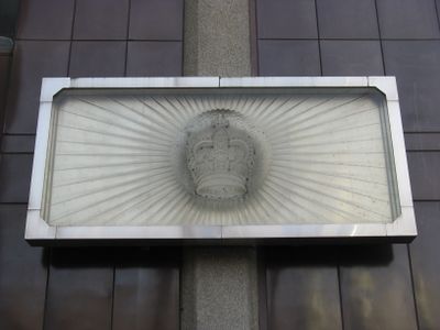 Silver Jubilee Crystal Crown, Sculpture en relief au Tower Hotel, London Borough of Tower Hamlets, Angleterre.