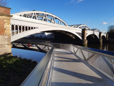 Le Dukes Meadows Footbridge est un passage piétonnier moderne qui traverse la Tamise à Chiswick et relie deux sections riveraines. Il dispose d'un tablier large et plat avec des garde-corps des deux côtés, offrant un passage sûr aux piétons, cyclistes et personnes utilisant des aides à la mobilité.