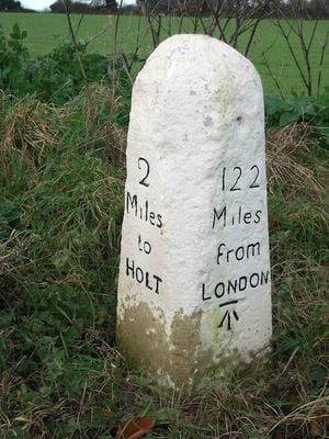 Milestone, 60yds N of FP style, c.1/2mile S of Holt Country Park entrance