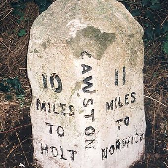 Milestone, c.150yds S of railway bridge, milestone in Cawston, Broadland, UK