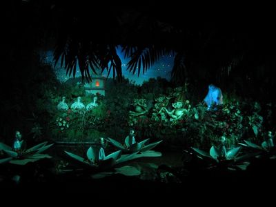 Les Nénuphars indiens présentent un spectacle nocturne où sept fleurs flottent sur un lac entouré de végétation tropicale et de créatures animées.