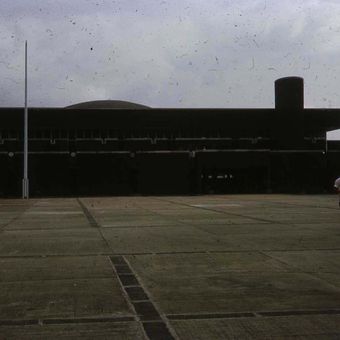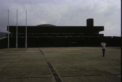 Le bâtiment du Parlement présente une chambre en forme de dôme disposée en fer à cheval, avec des lignes géométriques et des surfaces en béton brut.