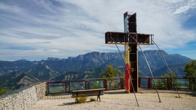 La Croix de Justin se dresse à 730 mètres d'altitude, offrant des vues panoramiques sur la vallée de la Drôme, la ville de Die et les imposantes barrières calcaires du massif du Vercors et des montagnes du Glandasse.