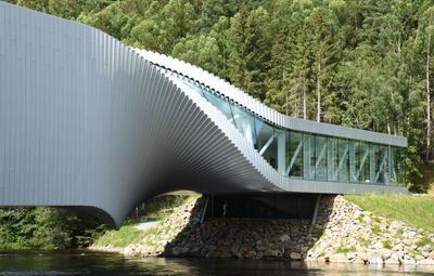 The Twist s'étend sur 60 mètres au-dessus de la rivière Randselva, associant une structure en aluminium à trois espaces d'exposition distincts.