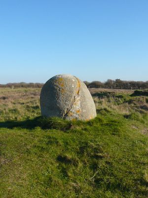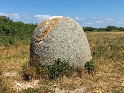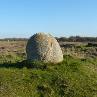 La Pierre de Saint Vio mesure un mètre de hauteur et de diamètre, présente des cupules et repose sur une base plane près des dunes.