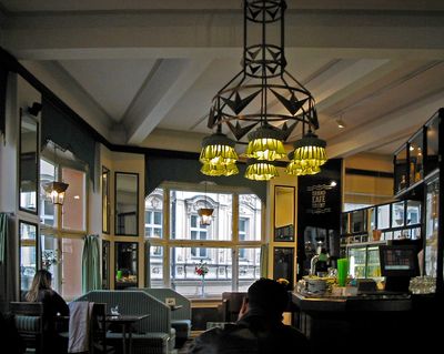 Le Grand Café Orient occupe le rez-de-chaussée de la Maison de la Madone Noire et affiche des motifs géométriques avec des éléments de design anguleux partout. L'espace est défini par du mobilier Cubiste, un éclairage spécial et des détails décoratifs qui forment une œuvre d'art cohérente.