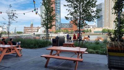 Depuis la terrasse extérieure, vous voyez le fleuve, les halles portuaires et les bâtiments de Wilhelminapier de l'autre côté de l'eau. Cette vue en fait un endroit spécial pour manger et boire en regardant le front de l'eau.