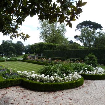 Les jardins de Montmarin s'étendent sur 6 hectares avec quatre terrasses descendant vers la Rance, intégrant des éléments français et des collections botaniques.