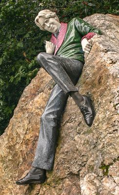 Le mémorial montre Oscar Wilde allongé sur un rocher de quartz blanc, portant une veste en jade vert et un col en thulite rose.