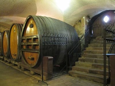 La cave voûtée de 1200 mètres carrés contient cinquante grands fûts de chêne et cinq tonneaux historiques de différents siècles, gérée par des œnologues.