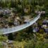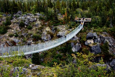 Le Pont suspendu du Yukon est une passerelle piétonne qui enjambe la rivière Tutshi aux eaux rapides, offrant des vues sur les falaises rocheuses et les fleurs sauvages en dessous. La structure est constituée de câbles d'acier et de planches en bois qui oscillent doucement lors de la traversée, créant une sensation de hauteur et d'ouverture.
