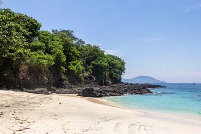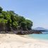 La bande de 130 mètres de sable doré se mélange aux grains volcaniques noirs, formant une baie étroite entourée de formations rocheuses.