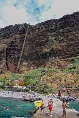 Sous le téléphérique se trouve une petite plage de sable qui n'est pas accessible depuis la route côtière, uniquement par ce téléphérique. Cette plage isolée est un endroit rare pour se baigner sur cette partie de la côte de Madère.