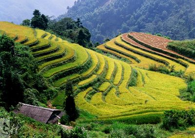Les rizières en terrasses de Hoàng Su Phì sont des champs agricoles qui descendent par rangées escarpées à travers plusieurs communes montagnardes. Les terrasses suivent les contours naturels du terrain depuis les hauteurs jusqu'aux fonds de vallée, couvrant environ 3.000 hectares.