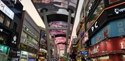 Le Daejeon Skyroad est une zone piétonne surélevée qui traverse le centre-ville et relie des boutiques, des salles d'arcade et des étals de marché traditionnels. Un grand écran LED au plafond affiche du contenu numérique et des publicités tout au long de la journée.