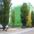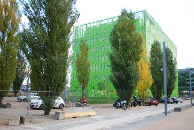 Le bâtiment Euronews présente une forme cubique verte avec deux grandes ouvertures circulaires dans sa façade en aluminium le long de la Saône.