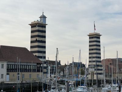 Le Belvédère de Deauville comprend deux tours de signalisation de 28 mètres de hauteur aux bandes noires et blanches dans le quartier de la Presqu'île.